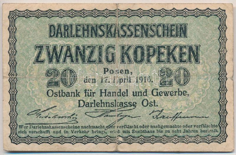 Lithuania / German occupation / Darlehnskasse Ost, Posen 1916. 20 Kopeks C:F,VG