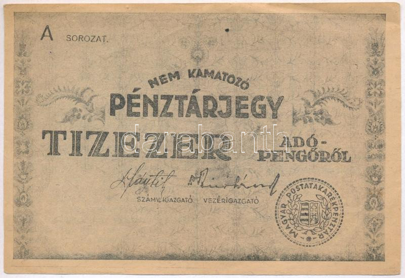 1946. 10.000AP nem kamatozó Pénztárjegy, "Másra Át Nem Ruházható&... https://www.darabanth.com/hu/285-Gyorsarveres/285.0/Numizmatika/Magyar-bankjegyek~300006/1946-10000AP-nem-kamatozo-Penztarjegy-Masra-At-Nem-Ruhazhato-nelkul-es-szamozas-ne~II1483996