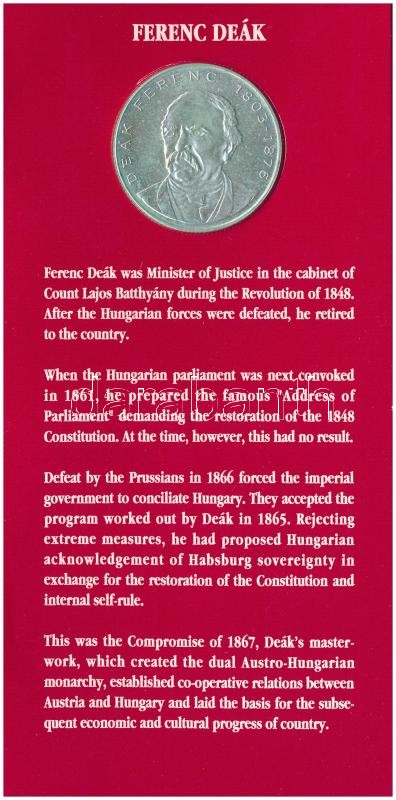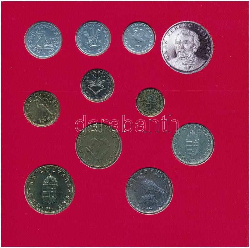 Leírás: 1994. 10f-200Ft (11xklf) forgalmi sor dísztokban, közte 1994. 200Ft Ag "Deák", "Magyarország pénzérméi" sorozat T:BU