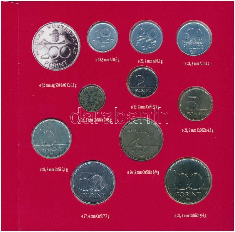 1994. 10f-200Ft (11xklf) forgalmi sor dísztokban, közte 1994. 200Ft Ag... https://www.darabanth.com/hu/285-Gyorsarveres/285.0/Numizmatika/Magyar-es-magyar-verdejelu-fem-es-ezustpenzek~300007/1994-10f-200Ft-11xklf-forgalmi-sor-disztokban-kozte-1994-200Ft-Ag-Deak-Magyarorszag-pe~II1492338