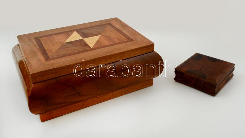 Leírás: 2 db intarziás fa doboz, 26×28 cm, 10×10 cm