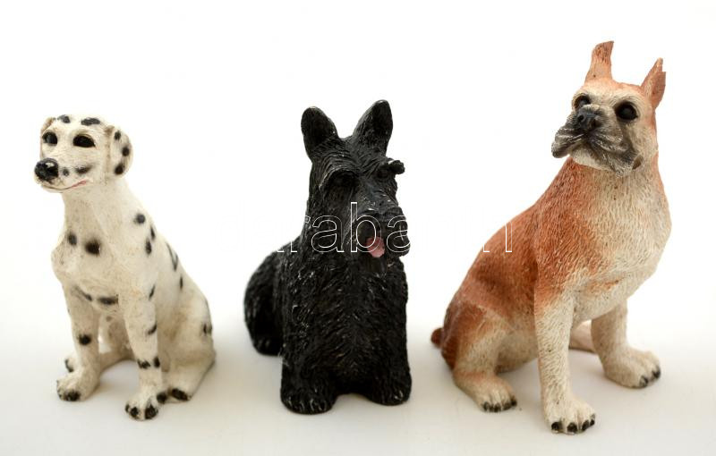 Leírás: 3 db kutyafigura (bulldog, schnautzer, dalmata), m: 5-9 cm