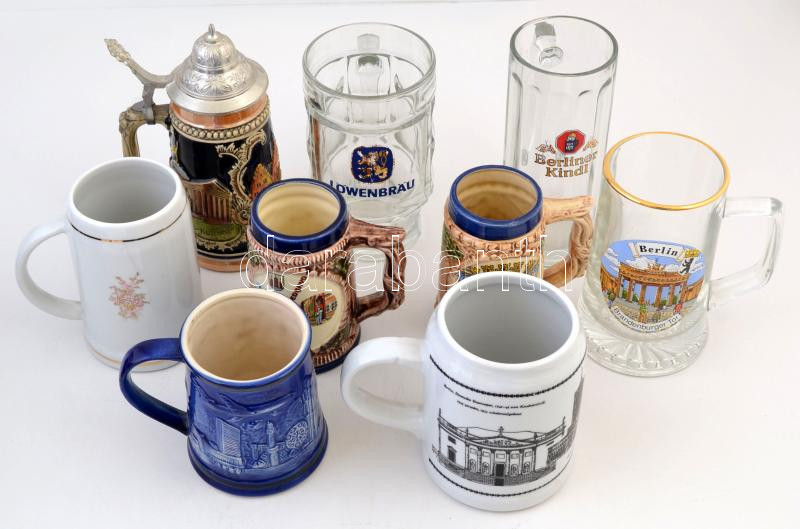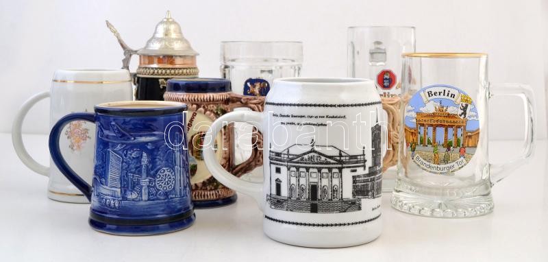 Leírás: 9 db különböző söröskorsó, közte 3 db üveg és 6 kerámia, 1 fedéllel