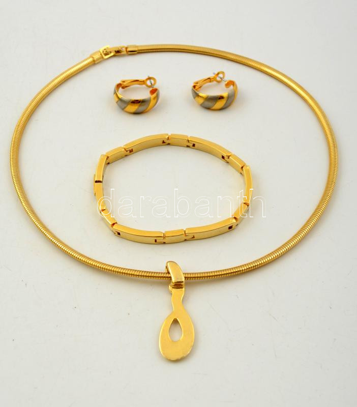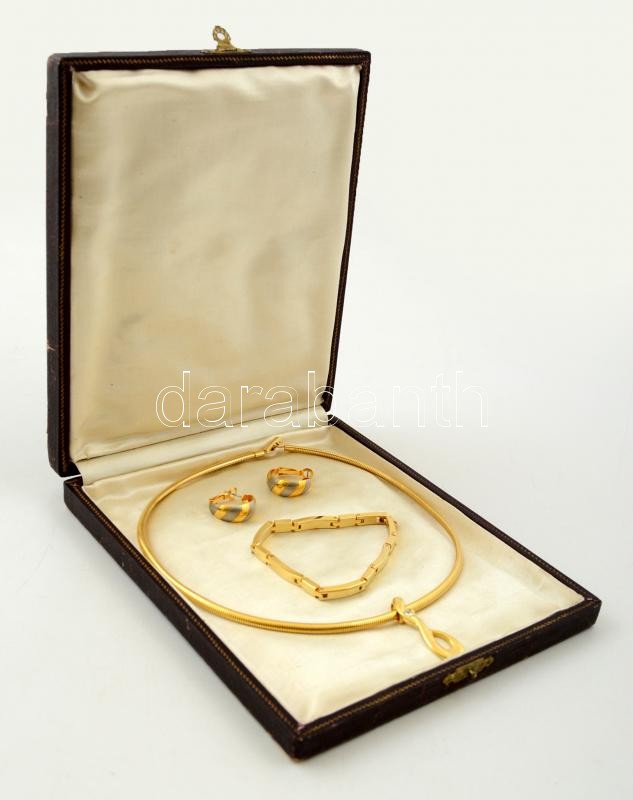 Leírás: Aranyszínű bizsu szett: nyaklánc, karkötő, fülbevaló pár, díszdobozban