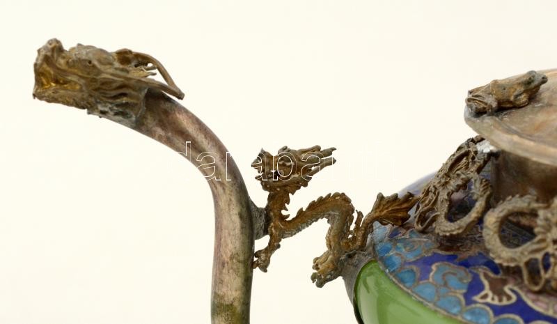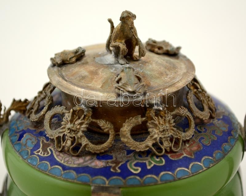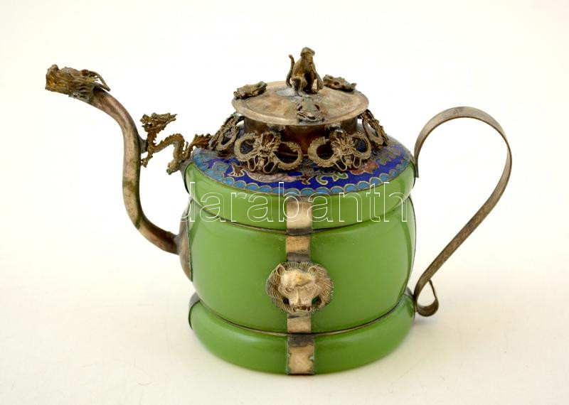 Leírás: Jádéval és zománccal díszített fém teáskanna, tetején apró majom figurával, m: 10 cm