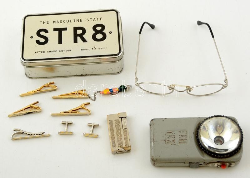 Leírás: Kis vegyes bolha tétel: retró elemlámpával, szemüveg kerettel, öngyújtóval és 5 darab retro nyakkendőcsipesz mandzsettagombokkal. Fém dobozban.