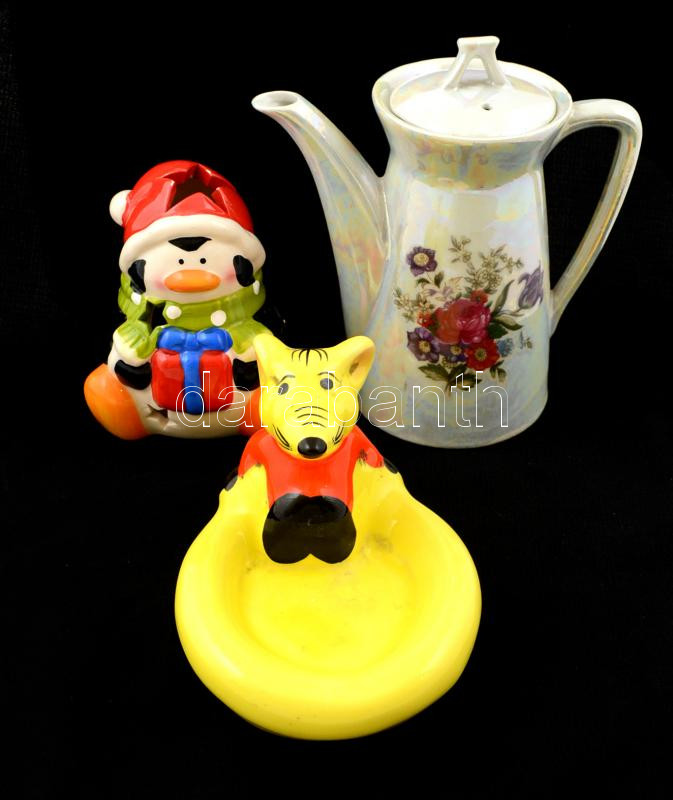 Leírás: Porcelán kiöntő + 2 db kerámia mécsestartó és hamutartó, lepattanásokkal, m: 9 és 17 cm