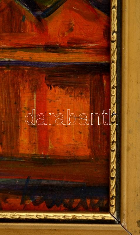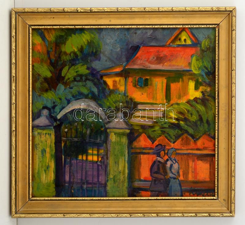 Leírás: Kmetty jelzéssel: Sétálok a kapunál. Olaj, falemez, keretben, 33×35 cm