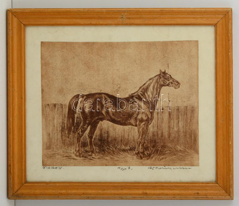 Leírás: Olvashatatlan jelzéssel: Ló. Rézkarc, papír, üvegezett keretben, 26×32 cm