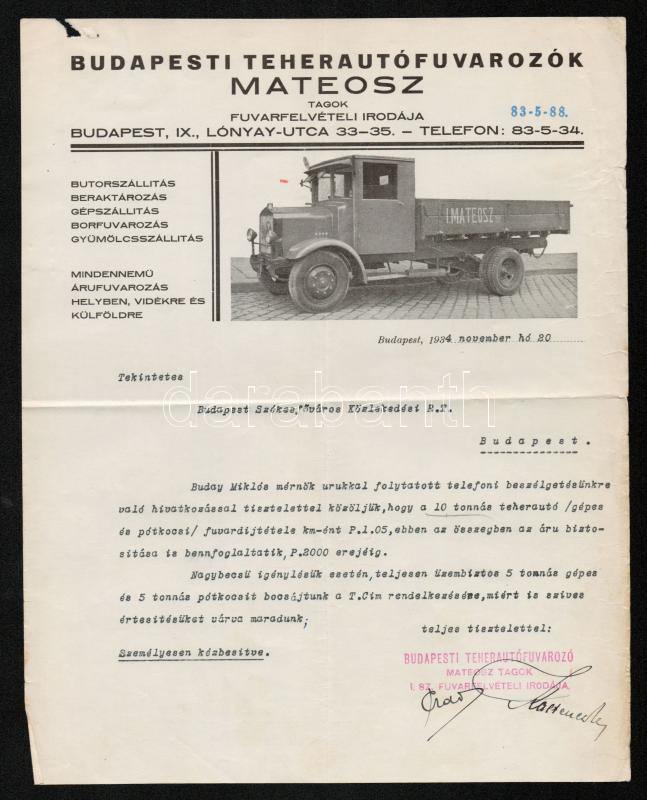 Leírás: MATEOSZ fuvarfelvételi iroda képes fejléces számla
