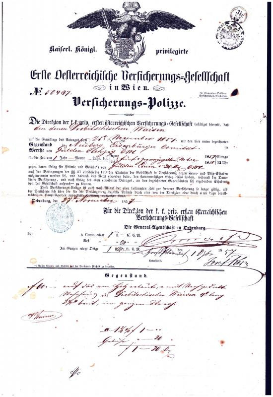 1857 Az Osztrák Biztosító Társaság kötvénye / Insurance bond https://www.darabanth.com/hu/286-Gyorsarveres/286.0/Festmeny-mutargy-papirregiseg-egyeb/Okmanyok~15/1857-Az-Osztrak-Biztosito-Tarsasag-kotvenye-Insurance-bond~II1499029