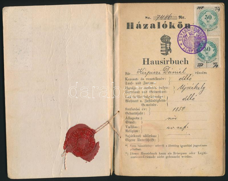 1896 Házaló könyv. Hausir Buch. 48p. https://www.darabanth.com/hu/286-Gyorsarveres/286.0/Festmeny-mutargy-papirregiseg-egyeb/Okmanyok~15/1896-Hazalo-konyv-Hausir-Buch-48p~II1498978