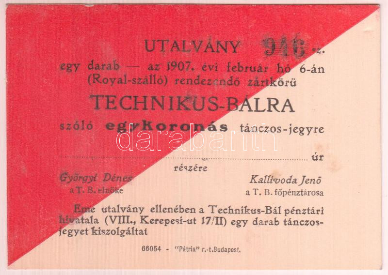 1907 Utalvány a Royal Szállóban tartandó technikus bálra https://www.darabanth.com/hu/286-Gyorsarveres/286.0/Festmeny-mutargy-papirregiseg-egyeb/Okmanyok~15/1907-Utalvany-a-Royal-Szalloban-tartando-technikus-balra~II1497603