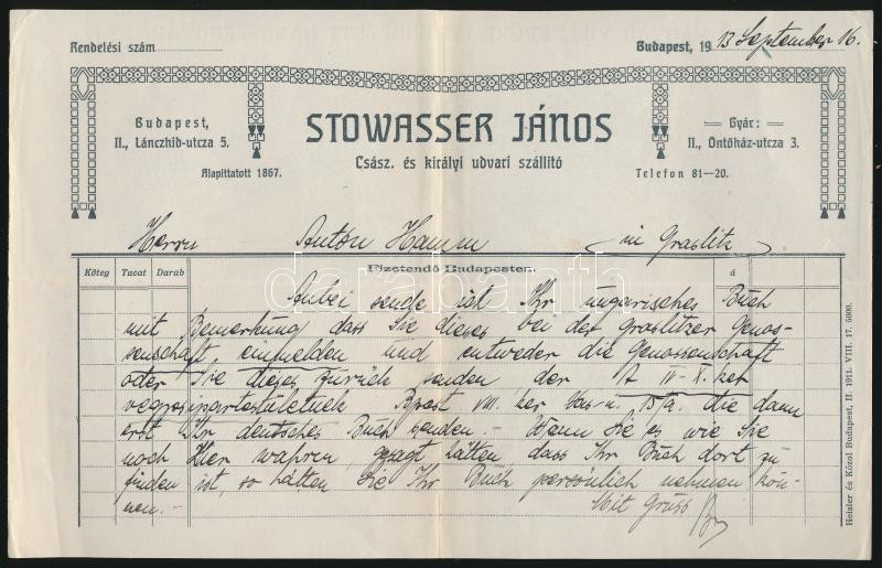 1913 Stowasser János cs. és kir. udvari szállító díszes fejléces száml... https://www.darabanth.com/hu/286-Gyorsarveres/286.0/Festmeny-mutargy-papirregiseg-egyeb/Okmanyok~15/1913-Stowasser-Janos-cs-es-kir-udvari-szallito-diszes-fejleces-szamlaja~II1498105