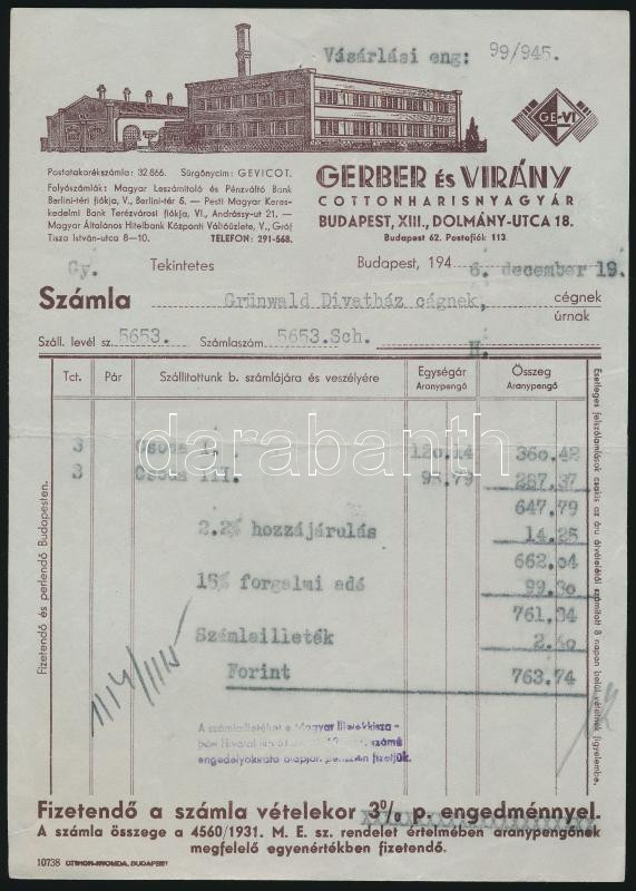 1946 Gerber és Virány harisnyagyár díszes fejléces számlája https://www.darabanth.com/hu/286-Gyorsarveres/286.0/Festmeny-mutargy-papirregiseg-egyeb/Okmanyok~15/1946-Gerber-es-Virany-harisnyagyar-diszes-fejleces-szamlaja~II1498084