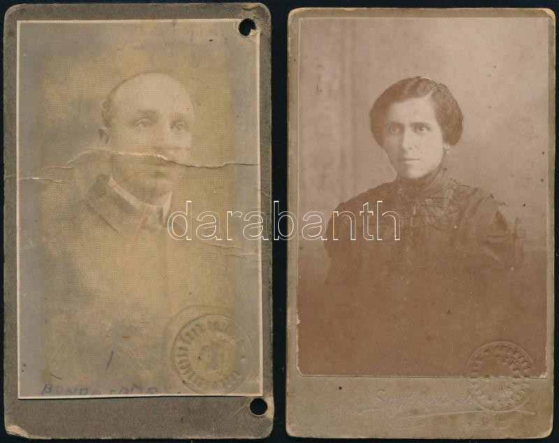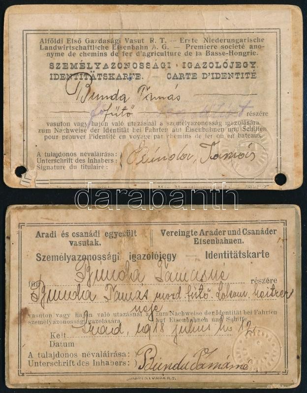 Leírás: cca 1918 2 db fényképes vasúti igazolvány (Arad és csanádi egyesült vasutak ill. Alföldi Első Gazdasági Vasút Rt.), mozdonyfűtő és felesége részére