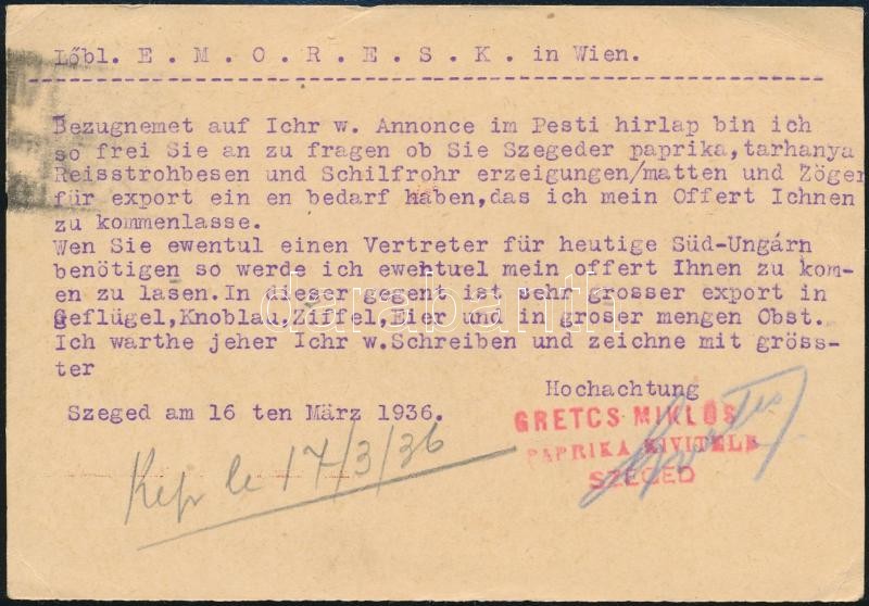 1936 Gretcs Miklós és Szögi Józsefné Paprika és Pflänzer und exportöre... https://www.darabanth.com/hu/286-Gyorsarveres/286.0/Festmeny-mutargy-papirregiseg-egyeb/Reklam~20/1936-Gretcs-Miklos-es-Szogi-Jozsefne-Paprika-es-Pflanzer-und-exportore-hirdeteses-levelezo~II1500989