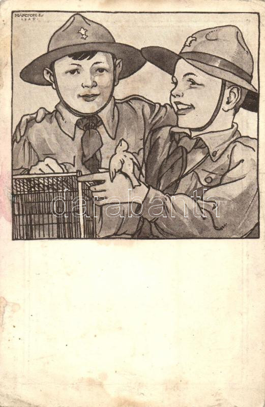 Leírás: Cserkészfiúk madárral és madárketreccel, Magyar Cserkészszövetség kiadása / Scout boys with birdcage and bird s: Márton L. (EK)