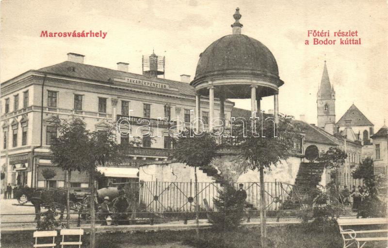 Marosvásárhely, Targu Mures; Fő tér, Bodor kút, Takarékpénztár, Fonciere Pesti Biztosító Intézet / square, savings bank, insurance company (vágott / cut)
