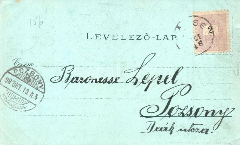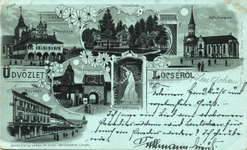 1898 Lőcse, Levoca; Városháza, megyeháza, városi főkapu, katolikus templom, kiadja Braun Fülöp, Krecsmár és Sacz / town hall, county hall, gate, church, floral, litho (EK)