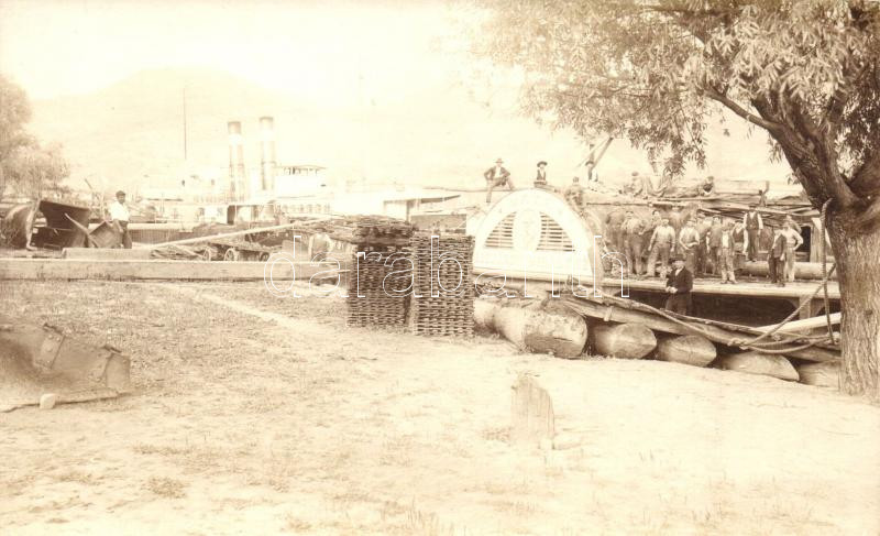 cca. 1912 Az MFTR kiégett Erzsébet Királyné gőzöse az átépítés előtt, munkások / The burned steamship 'Erzsébet Királyné' before the reconstruction, workers, photo