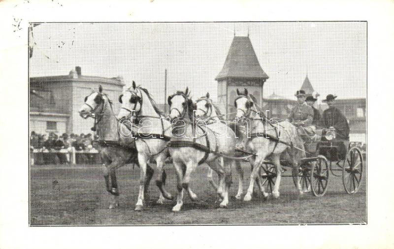 Leírás: Budapest VII. Lóversenypálya, öt lovas fogat