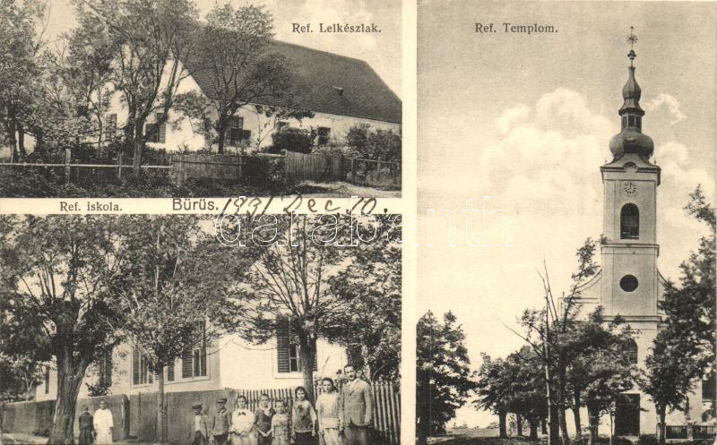 Leírás: Bürüs, Református templom, iskola és lelkészlak