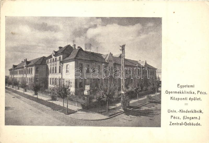 Leírás: Pécs, Egyetemi Gyermekklinika, kórház, központi épület, Dunántúl kiadása (14 cm x 10,5 cm) (EK)
