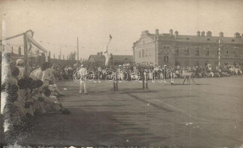 Leírás: 1919 Tornászok a szeren egy augusztus 20-ai ünnepségen / Hungarian gymnasts, National Day, photo (felületi sérülés / surface damage)