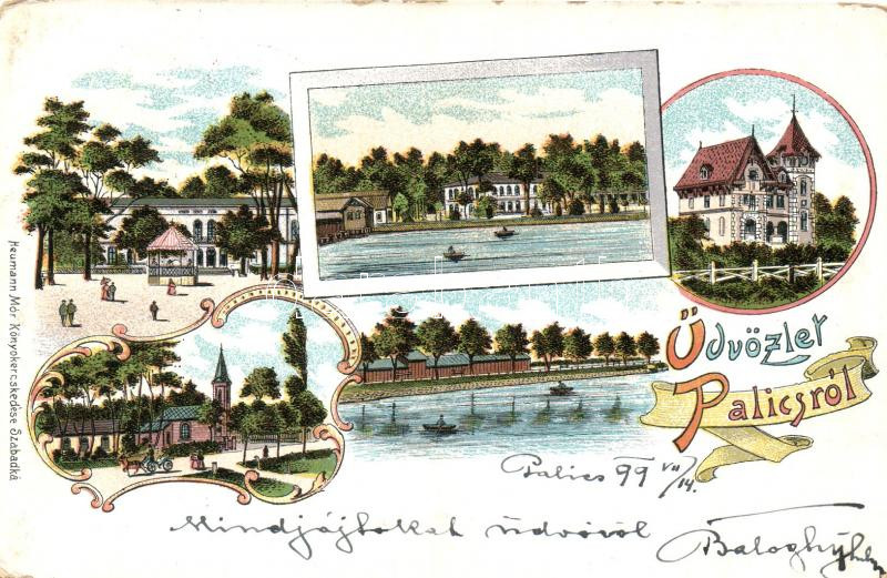 Leírás: 1899 Palics, Palic; Villa, strand, templom, Heumann Mór kiadása / villa, beach, church, Art Nouveau litho (kopott sarkak / worn corners)