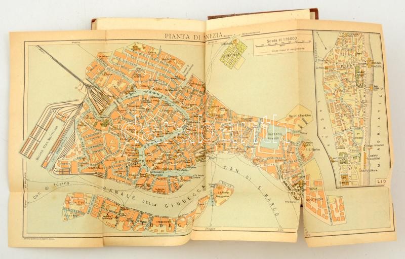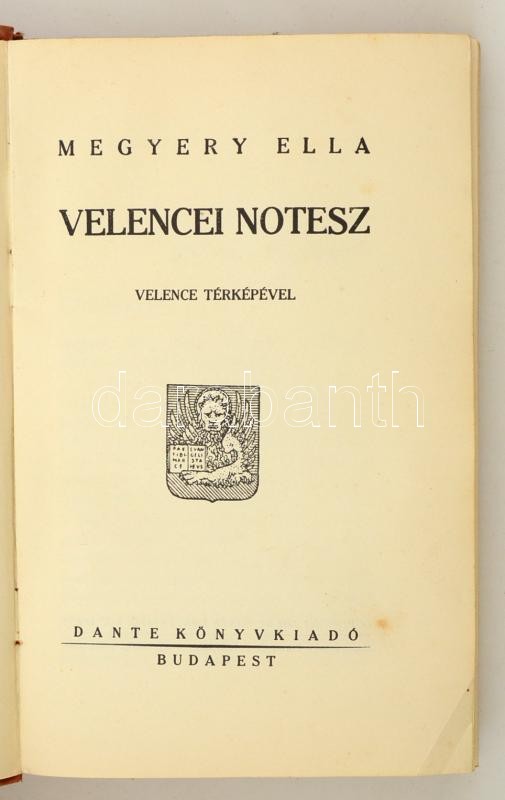 Megyery Ella: Velencei notesz. Bp., (1937), Dante. Kiadói papírkötés, kissé foltos, kissé kopottas borítóval, Velence térképével, a térkép a hajtások mentén szakadozott.