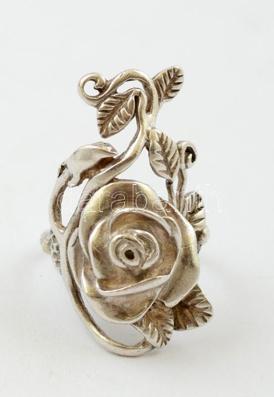 Ezüst(Ag) rózsa gyűrű, jelzett, méret: 57, nettó: 9,2 g https://www.darabanth.com/hu/286-Gyorsarveres/286.0/Nemesfem-Disztargyak-Orak-es-Ekszerek/Nemesfem-Disztargyak-Orak-es-Ekszerek~48/EzustAg-rozsa-gyuru-jelzett-meret-57-netto-9-2-g~II1497259