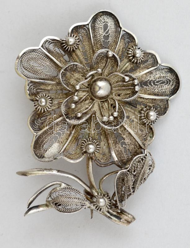 Ezüst(Ag) virág alakú filigrán kitűző, jelzett, 4,8x3,8 g, nettó: 7,1 ... https://www.darabanth.com/hu/286-Gyorsarveres/286.0/Nemesfem-Disztargyak-Orak-es-Ekszerek/Nemesfem-Disztargyak-Orak-es-Ekszerek~48/EzustAg-virag-alaku-filigran-kituzo-jelzett-4-8x3-8-g-netto-7-1-g~II1497188
