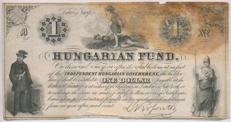 Hungary 1852. 1... https://www.darabanth.com/hu/286-Gyorsarveres/286.0/Numizmatika/Magyar-bankjegyek~400006/1852-1USD-B-Kossuth-banko-sorszam-nelkul-TIII-fo--Hungary-1852-1-Dollar-B-Hungarian-Fun~II1499915