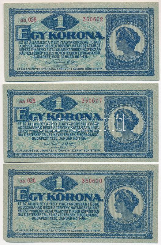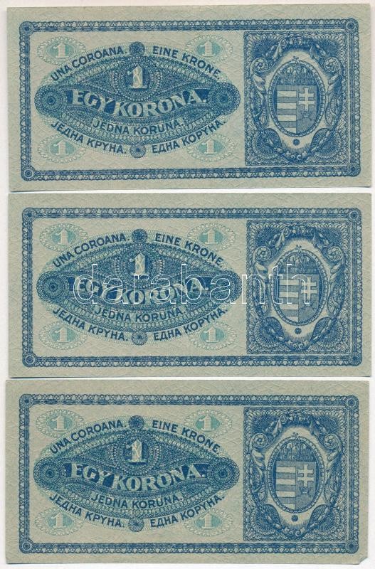 1920. 1K (3x) sötétvörös sorszámmal, közeli sorszámok T:I-II https://www.darabanth.com/hu/286-Gyorsarveres/286.0/Numizmatika/Magyar-bankjegyek~400006/1920-1K-3x-sotetvoros-sorszammal-kozeli-sorszamok-TI-II~II1499867