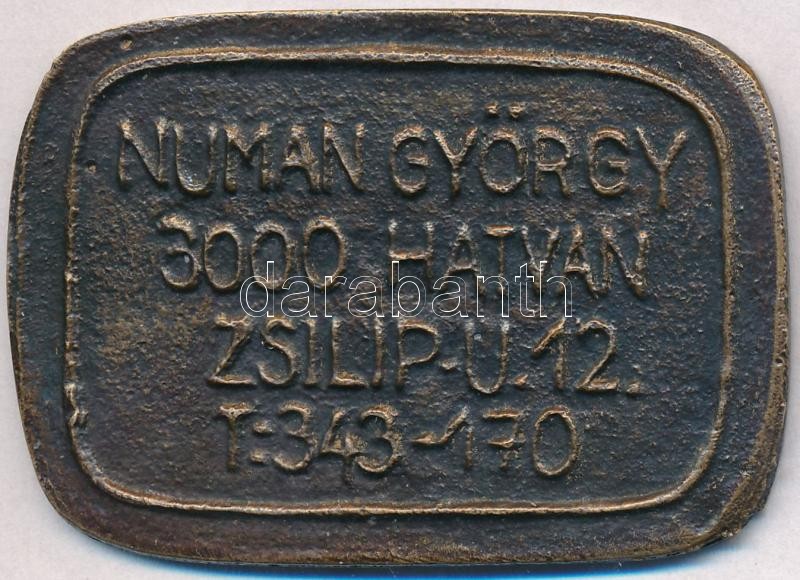 Leírás: DN "Numan Görgy 3000 Hatvan Zsilip u. 12. T:343-170" Br névjegyérem (55,5x39,5mm) T:2