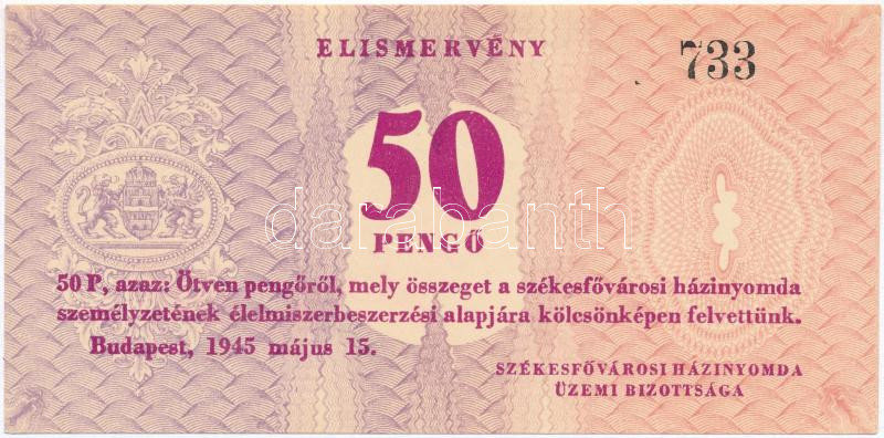 1945. "Székesfővárosi Házinyomda" elismervény 50P-ről T:I https://www.darabanth.com/hu/286-Gyorsarveres/286.0/Numizmatika/Magyar-es-kulfoldi-papir-es-fem-szuksegpenzek~400005/1945-Szekesfovarosi-Hazinyomda-elismerveny-50P-rol-TI~II1497936