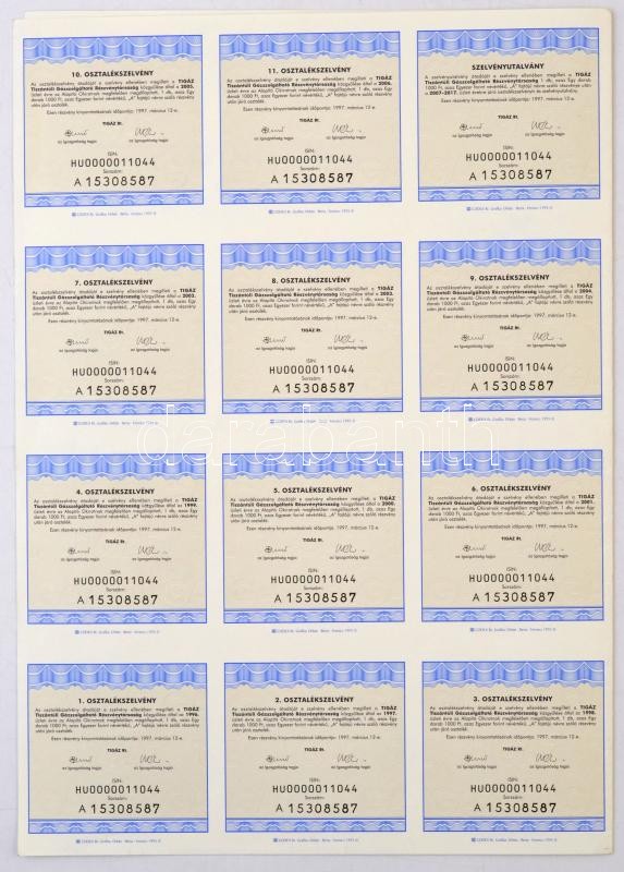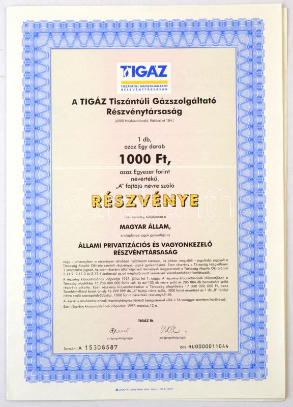 Leírás: 1997. "TIGÁZ Tiszántúli Gázszolgáltató Részvénytársaság" részvénye 1000Ft-ról, szelvényekkel T:I-