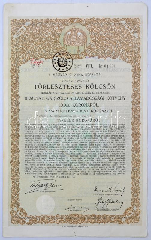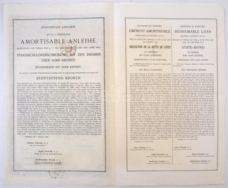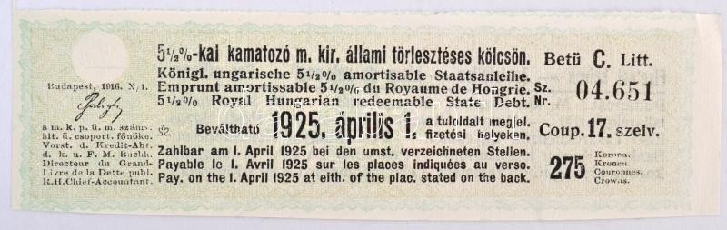 Budapest 1916. "A Magyar Korona Országai 5 1/2%-al Kamatozó Törlesztéses Kölcsön" kötvénye 10.000K-ról, szárazpecséttel, bélyegzéssel és 1db szelvénnyel T:II