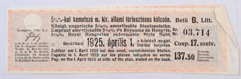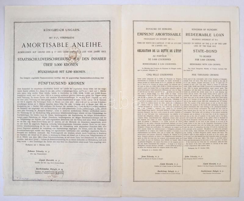 Budapest 1916. "A Magyar Korona Országai 5 1/2%-al Kamatozó Törlesztéses Kölcsön" kötvénye 5000K-ról, szárazpecséttel, bélyegzéssel és 1db szelvénnyel T:II- kis szakadás