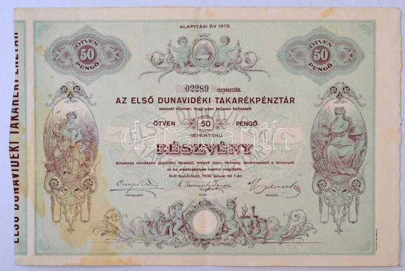 Kiskőrös 1930. "Első Dunavidéki Takarékpénztár" részvénye 50P-ről, sze... https://www.darabanth.com/hu/286-Gyorsarveres/286.0/Numizmatika/Reszvenyek-es-sorsjegyek~400004/Kiskoros-1930-Elso-Dunavideki-Takarekpenztar-reszvenye-50P-rol-szelvenyekkel-szaraz~II1497457