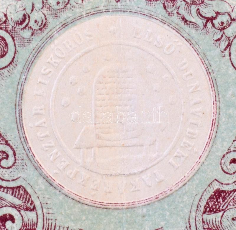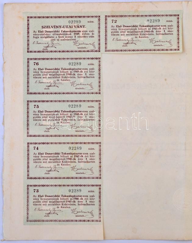 Leírás: Kiskőrös 1930. "Első Dunavidéki Takarékpénztár" részvénye 50P-ről, szelvényekkel, szárazpecséttel T:II