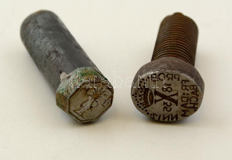 Leírás: 1835 2 db egyedi készítésű pecsétnyomó; M. U. monogrammal és 1835 PROB NNIZ FR:DAM BACH. felirattal, csavarból átalakítva