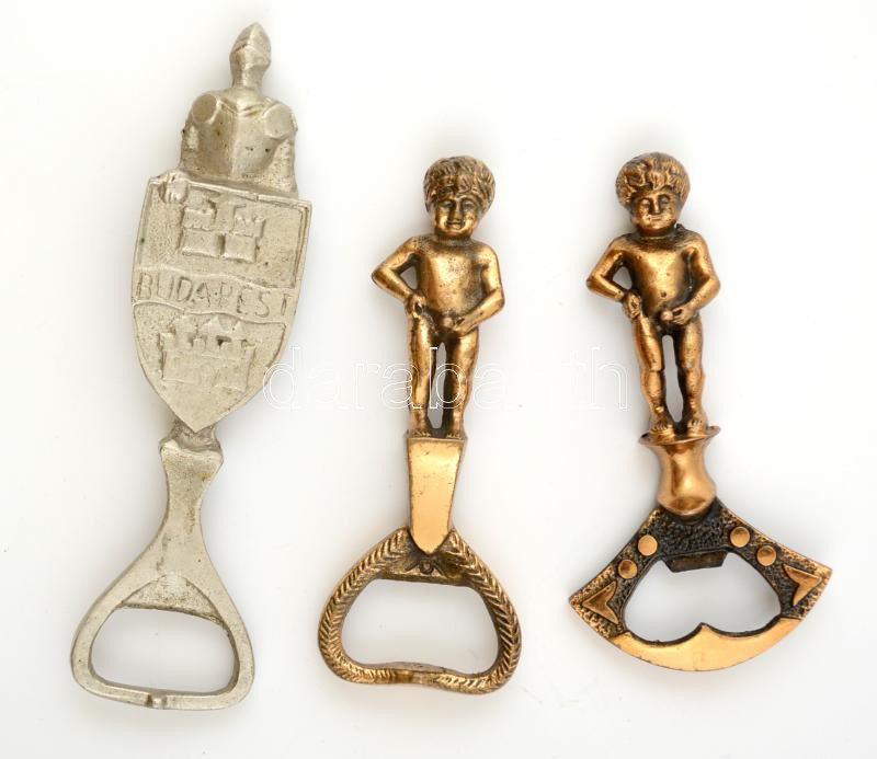 Leírás: 3 db (2 db réz) fém figurás sörnyitő: Budapest címer lovaggal, pisilő kisfiú