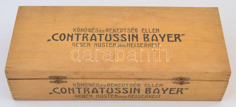 'Contratussin Bayer', gyógyszerreklámos fadoboz, kissé viseltes állapo... https://www.darabanth.com/hu/287-Gyorsarveres/287.0/Festmeny-mutargy-papirregiseg-egyeb/Bolhapiac~100011/Contratussin-Bayer-gyogyszerreklamos-fadoboz-kisse-viseltes-allapotban-a-fem-kapcsok-nem-j~II1509116