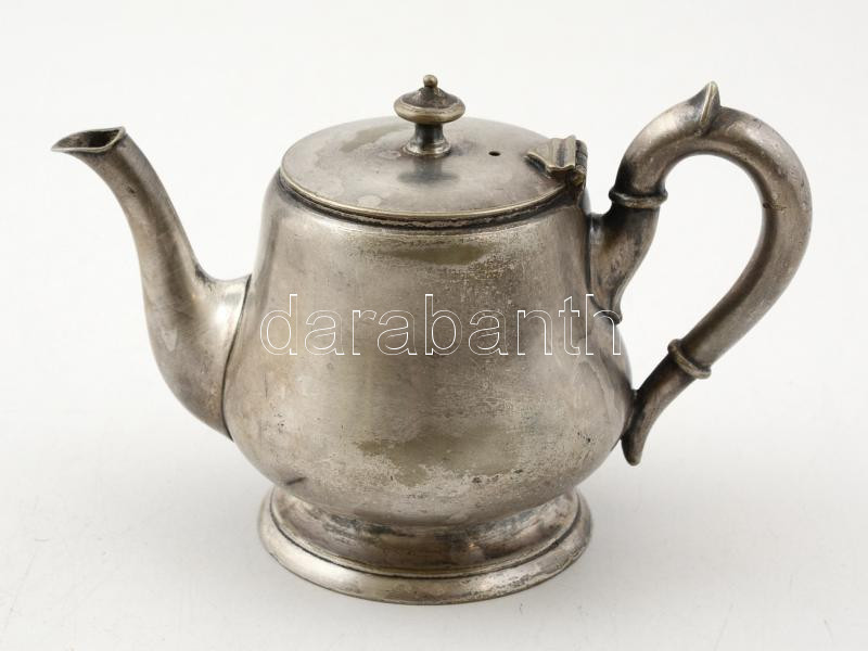 Leírás: J.L.Hermann ezüstözött alpakka kis kávés kiöntő, " Otthon kávéház" felirattal az alján, apró horpadással, jelzett, m:9 cm