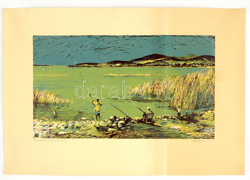 Csavlek András (1942-): Balatoni horgászok. Színes linómetszet, papír,... https://www.darabanth.com/hu/287-Gyorsarveres/287.0/Festmeny-mutargy-papirregiseg-egyeb/Festmenyek-es-grafikak~100001/Csavlek-Andras-1942-Balatoni-horgaszok-Szines-linometszet-papir-jelzett-felcsavarva-25~II1507254