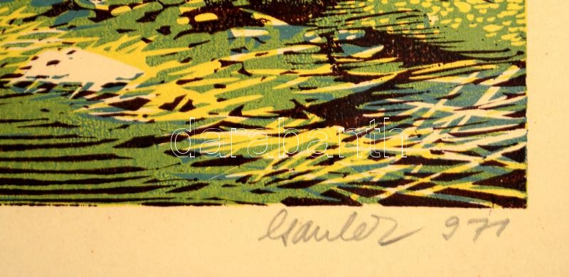 Leírás: Csavlek András (1942-): Balatoni horgászok. Színes linómetszet, papír, jelzett, felcsavarva, 25×48 cm
