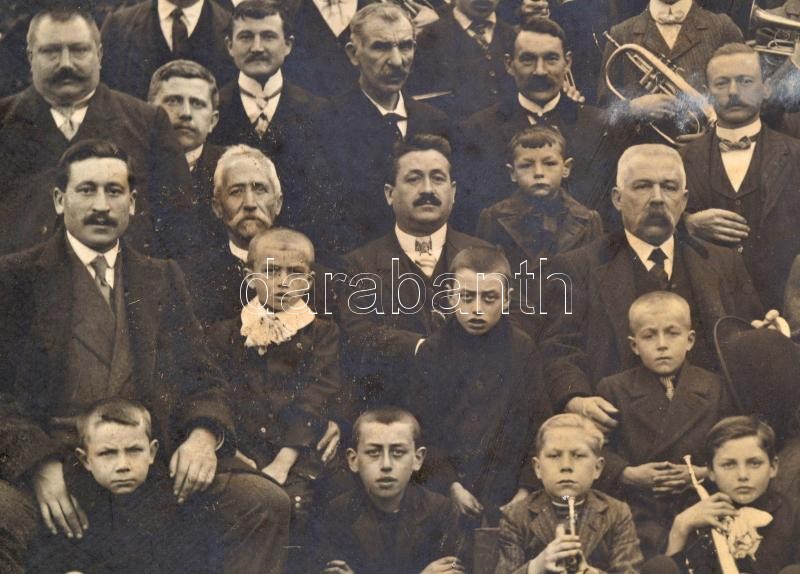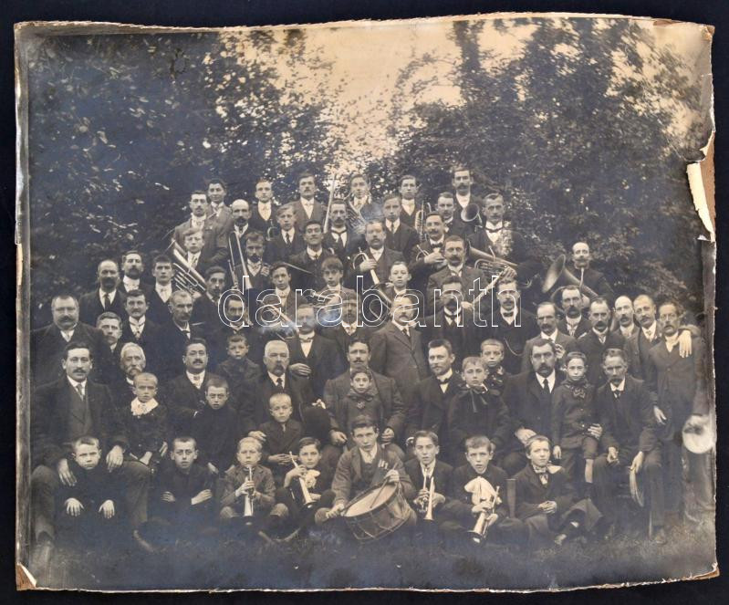 Leírás: 1930 A kovásznai fúvószenekar, csoportkép, nagyméretű fotó, hátulján feliratozva, vetemedett, szélein sérült, 40×50 cm