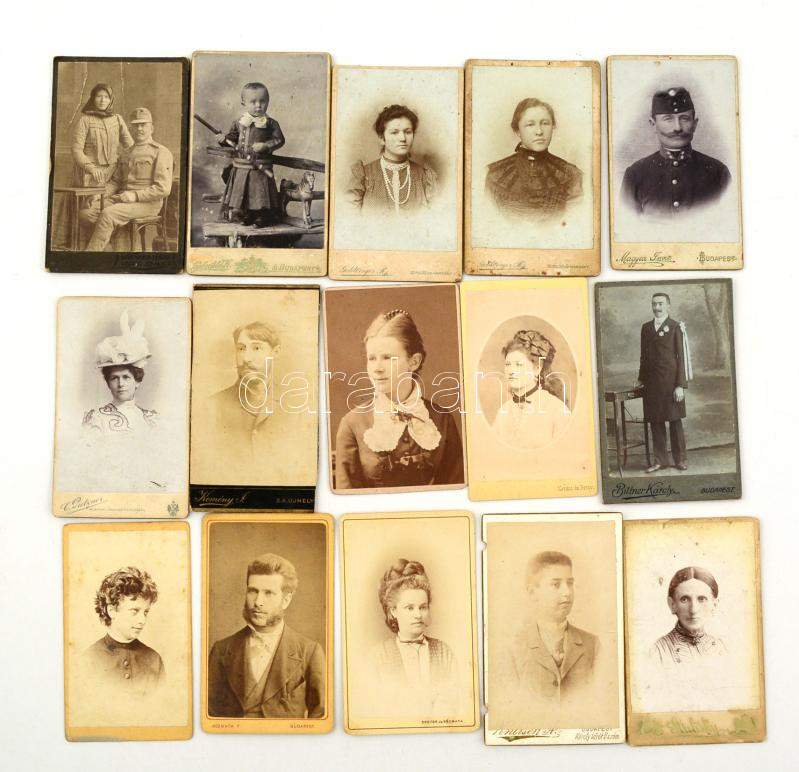 cca 1900-1910 15 db keményhátú portérfotó, közte katonai is, különböző műtermekből(Budapest-Kozmata, Szatmár, Siklós, Bécs, Sátoraljaújhely), egy körbevágva, 11x7 cm